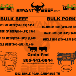 General Bulk: This may be beef ordered in, trusted beef that are harvested at our facility, or Bryant’s own raised beef. This purchase is our pick based on our labor board and feed lot standings. Convenience to us is solely what makes this bulk package the cheapest.